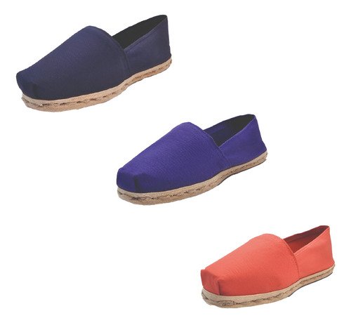 TriPack de alpargata iberia con modelos azul marino, morado y terracota con un rango de talla de 34 a 39.