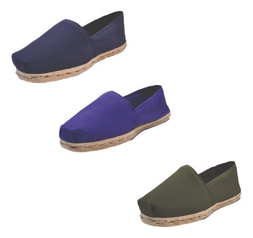 TriPack de alpargata iberia con modelos azul marino, morado y verde militar con un rango de talla de 34 a 39.