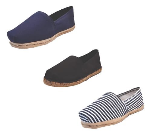 TriPack de alpargata iberia con modelos azul marino, negro goma y ray azul/blanco con un rango de talla de 34 a 39.