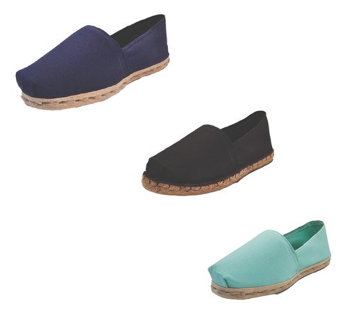 TriPack de alpargata iberia con modelos azul marino, negro goma y turquesa con un rango de talla de 34 a 39.
