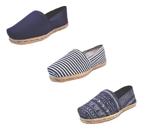 TriPack de alpargata iberia con modelos azul marino, ray azul/blanco y azul étnico con un rango de talla de 34 a 39.