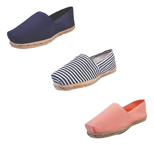 TriPack de alpargata iberia con modelos azul marino, ray azul/blanco y coral con un rango de talla de 34 a 39.