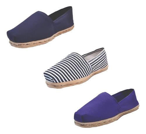 TriPack de alpargata iberia con modelos azul marino, ray azul/blanco y morado con un rango de talla de 34 a 39.