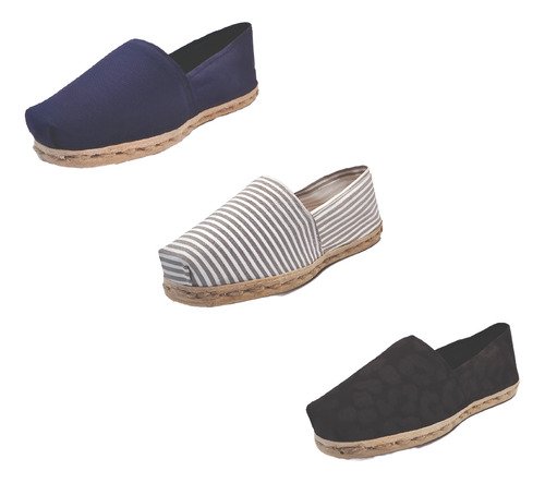 TriPack de alpargata iberia con modelos azul marino, ray gris/blan y animal pr neg con un rango de talla de 34 a 39.