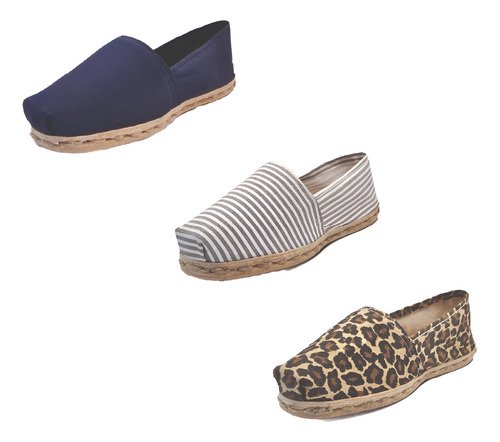 TriPack de alpargata iberia con modelos azul marino, ray gris/blanco y animal pr con un rango de talla de 34 a 39.