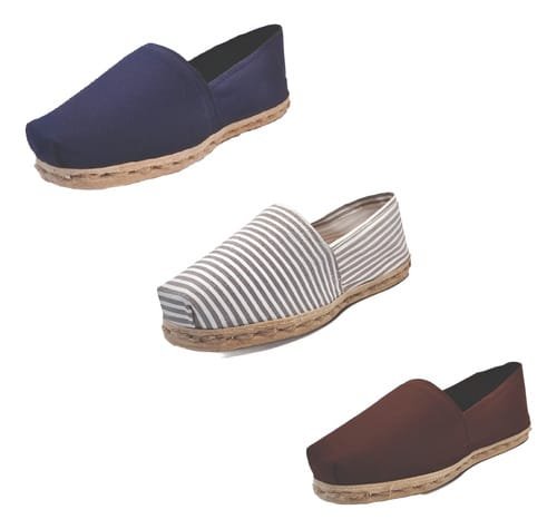 TriPack de alpargata iberia con modelos azul marino, ray gris/blanco y café con un rango de talla de 34 a 39.