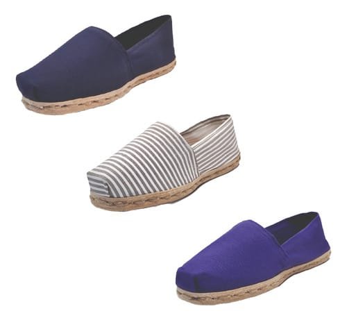 TriPack de alpargata iberia con modelos azul marino, ray gris/blanco y morado con un rango de talla de 34 a 39.