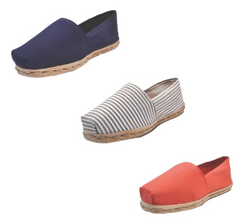 TriPack de alpargata iberia con modelos azul marino, ray gris/blanco y terracota con un rango de talla de 34 a 39.