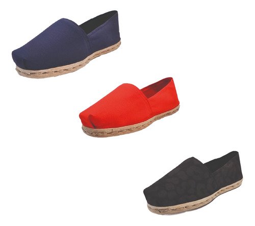 TriPack de alpargata iberia con modelos azul marino, rojo y animal print negro con un rango de talla de 34 a 39.