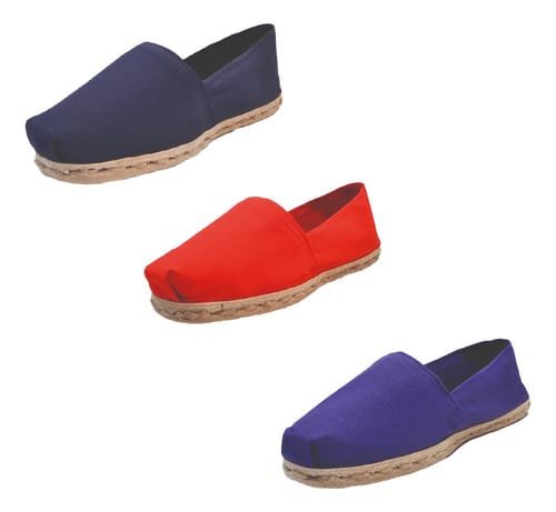 TriPack de alpargata iberia con modelos azul marino, rojo y morado con un rango de talla de 34 a 39.