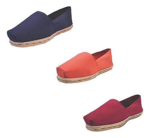 TriPack de alpargata iberia con modelos azul marino, terracota y burdeo con un rango de talla de 34 a 39.