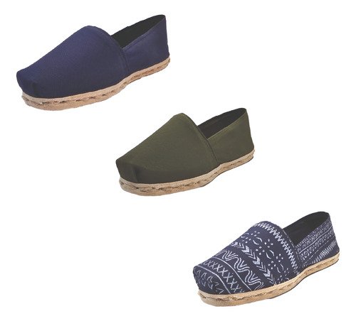TriPack de alpargata iberia con modelos azul marino, verde militar y azul étnico con un rango de talla de 34 a 39.