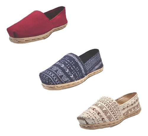TriPack de alpargata iberia con modelos burdeo, azul étnico y crudo étnico con un rango de talla de 34 a 39.