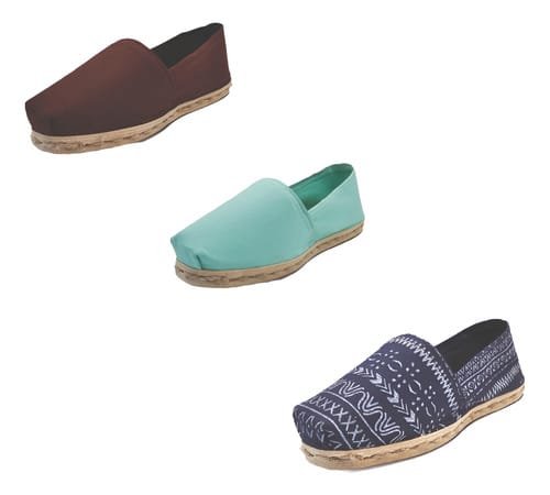 TriPack de alpargata iberia con modelos café, turquesa y azul étnico con un rango de talla de 34 a 39.