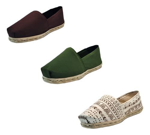 TriPack de alpargata iberia con modelos café, verde militar y crudo étnico con un rango de talla de 34 a 39.