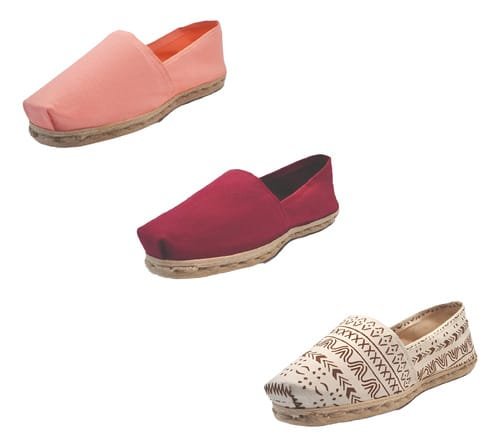 TriPack de alpargata iberia con modelos coral, burdeo y crudo étnico con un rango de talla de 34 a 39.