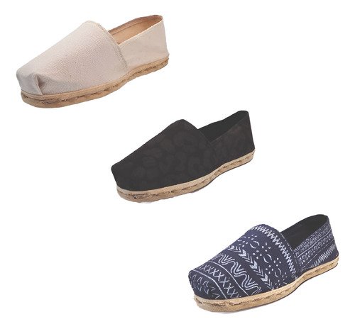 TriPack de alpargata iberia con modelos crudo, animal print negro y azul étnico con un rango de talla de 34 a 39.