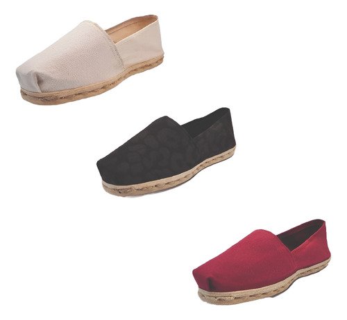 TriPack de alpargata iberia con modelos crudo, animal print negro y burdeo con un rango de talla de 34 a 39.