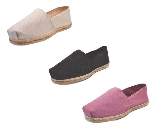 TriPack de alpargata iberia con modelos crudo, animal print negro y jacarandá con un rango de talla de 34 a 39.
