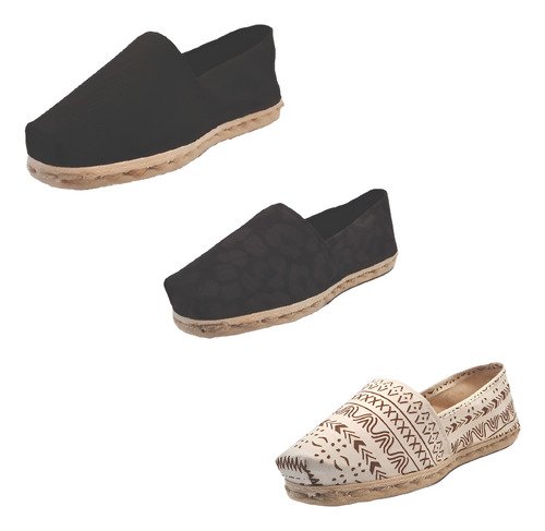 TriPack de alpargata iberia con modelos negro, animal print negro y crudo étnico con un rango de talla de 34 a 39.