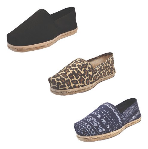 TriPack de alpargata iberia con modelos negro, animal print y azul étnico con un rango de talla de 34 a 39.