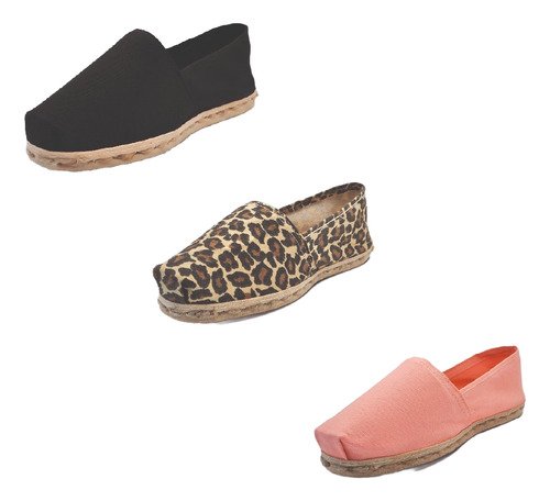 TriPack de alpargata iberia con modelos negro, animal print y coral con un rango de talla de 34 a 39.