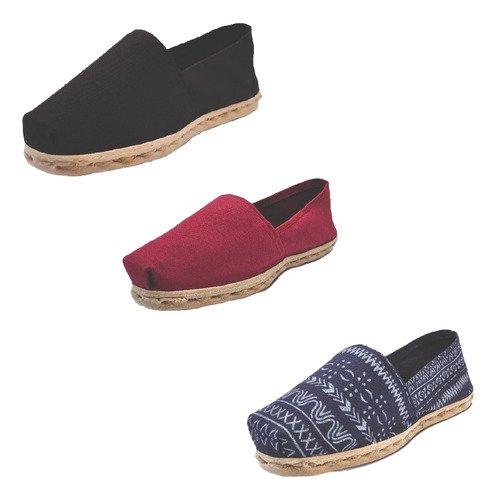 TriPack de alpargata iberia con modelos negro, burdeo y azul étnico con un rango de talla de 34 a 39.