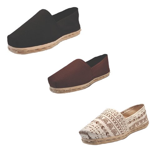 TriPack de alpargata iberia con modelos negro, café y crudo étnico con un rango de talla de 34 a 39.
