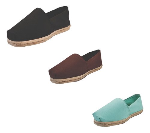 TriPack de alpargata iberia con modelos negro, café y turquesa con un rango de talla de 34 a 39.