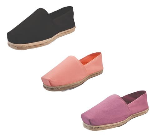 TriPack de alpargata iberia con modelos negro, coral y jacarandá con un rango de talla de 34 a 39.