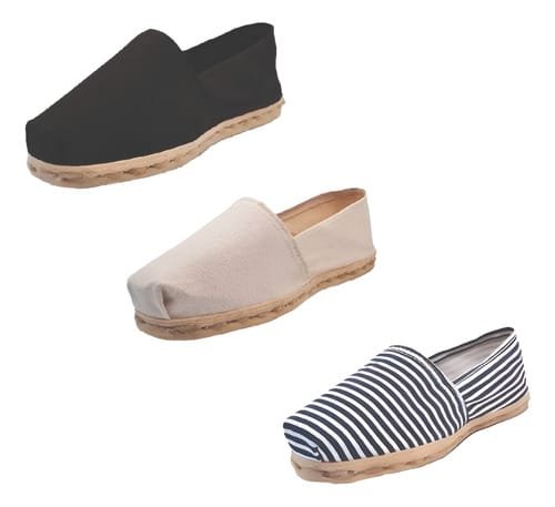 TriPack de alpargata iberia con modelos negro, crudo y rayado azul/blanco con un rango de talla de 34 a 39.