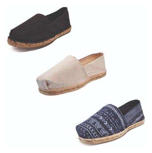 TriPack de alpargata iberia con modelos negro goma, crudo y azul étnico con un rango de talla de 34 a 39.