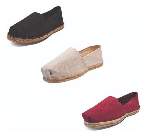 TriPack de alpargata iberia con modelos negro goma, crudo y burdeo con un rango de talla de 34 a 42.