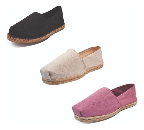 TriPack de alpargata iberia con modelos negro goma, crudo y jacarandá con un rango de talla de 34 a 39.