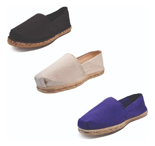 TriPack de alpargata iberia con modelos negro goma, crudo y morado con un rango de talla de 34 a 39.