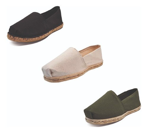 TriPack de alpargata iberia con modelos negro goma, crudo y verde militar con un rango de talla de 34 a 42.