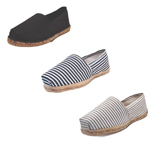 TriPack de alpargata iberia con modelos negro goma, ray azul/bla y ray gris/bla con un rango de talla de 34 a 39.