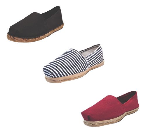 TriPack de alpargata iberia con modelos negro goma, ray azul/bla y burdeo con un rango de talla de 34 a 39.