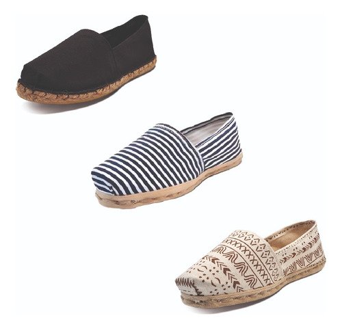 TriPack de alpargata iberia con modelos negro goma, ray azul/bla y crudo étnico con un rango de talla de 34 a 39.