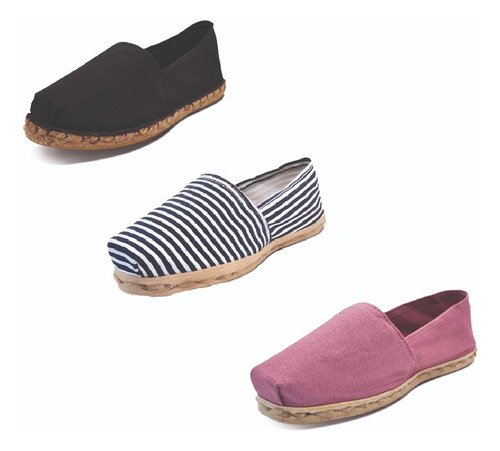 TriPack de alpargata iberia con modelos negro goma, ray azul/bla y jacarandá con un rango de talla de 34 a 39.