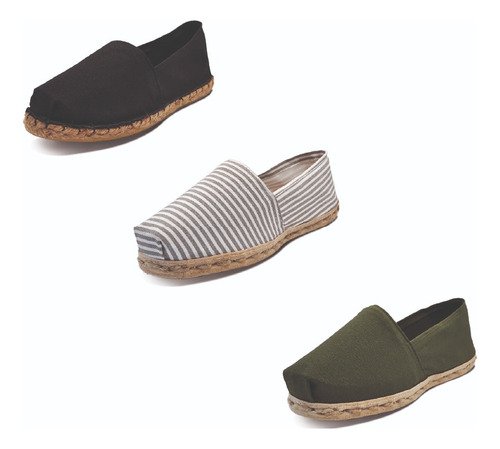 TriPack de alpargata iberia con modelos negro goma, ray gris/bla y verde militar con un rango de talla de 34 a 39.