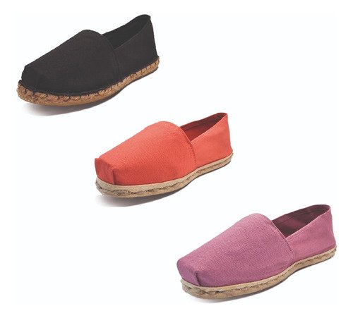 TriPack de alpargata iberia con modelos negro goma, terracota y jacarandá con un rango de talla de 34 a 39.