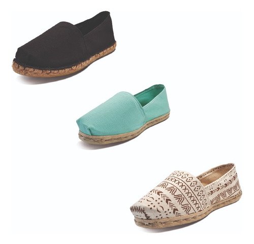 TriPack de alpargata iberia con modelos negro goma, turquesa y crudo étnico con un rango de talla de 34 a 39.