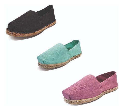 TriPack de alpargata iberia con modelos negro goma, turquesa y jacarandá con un rango de talla de 34 a 39.