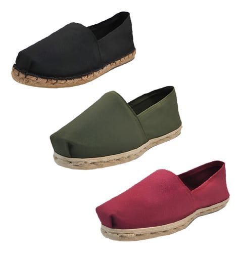 TriPack de alpargata iberia con modelos negro goma, verde militar y burdeo con un rango de talla de 34 a 42.