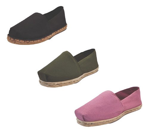 TriPack de alpargata iberia con modelos negro goma, verde militar y jacarandá con un rango de talla de 34 a 39.