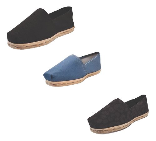 TriPack de alpargata iberia con modelos negro, mezclilla y animal print negro con un rango de talla de 34 a 39.
