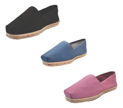 TriPack de alpargata iberia con modelos negro, mezclilla y jacarandá con un rango de talla de 34 a 39.