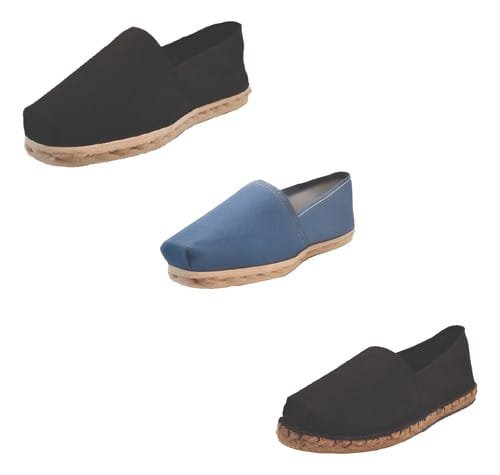 TriPack de alpargata iberia con modelos negro, mezclilla y negro refuerzo goma con un rango de talla de 34 a 42.