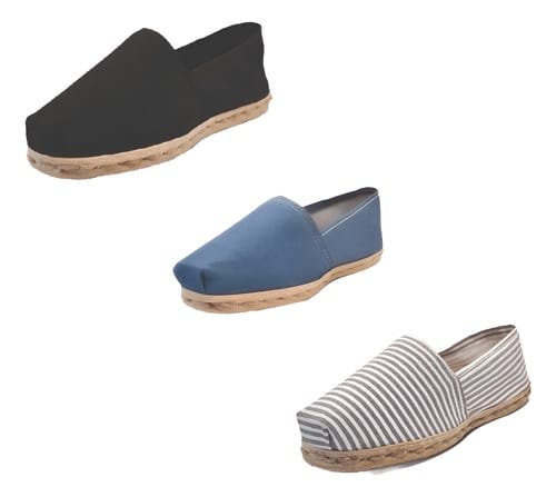 TriPack de alpargata iberia con modelos negro, mezclilla y rayado gris/blanco con un rango de talla de 34 a 39.